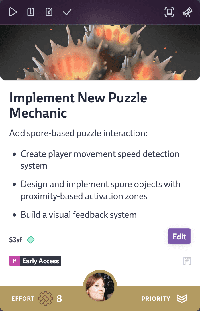 Explore your game’s pillars, features, and creative direction on an infinite canvas. Link ideas directly to tasks so your vision isn’t just a document—it’s a living foundation that stays connected to the work.